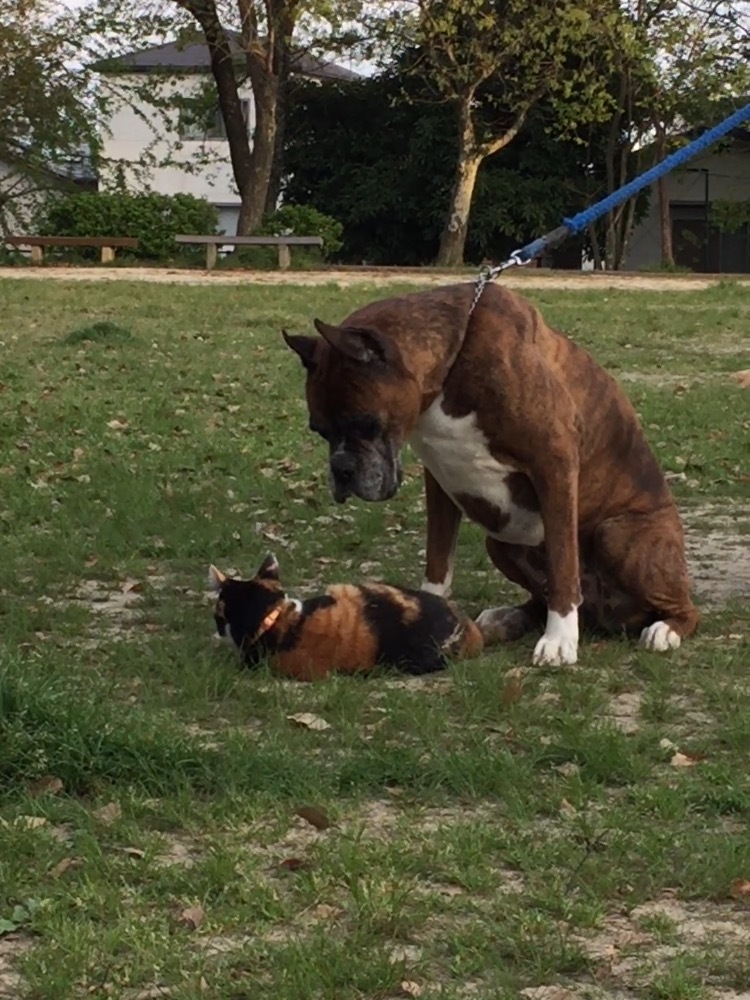 【大型犬のボクサー「リキ」ちゃんと 保護猫「ミケ」ちゃん のカワイイデートのお写真をお届けします】