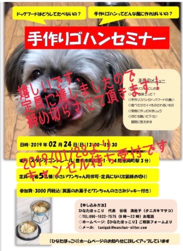 2019/02/24【手作りゴハンセミナー】は01/23に定員に達しました。嬉しい次第です。本当に有難うございました。本日よりキャンセル待ちを受付させて頂こうと思います。