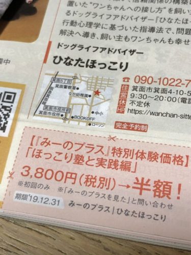 箕面地域みっちゃく生活情報誌『me-no(みーの』に掲載』・【吠えるワンちゃん特別塾】新しいコースの半額割引券付です 先日の台風19号で被災された方々にお見舞い申し上げます 1日でも早く…