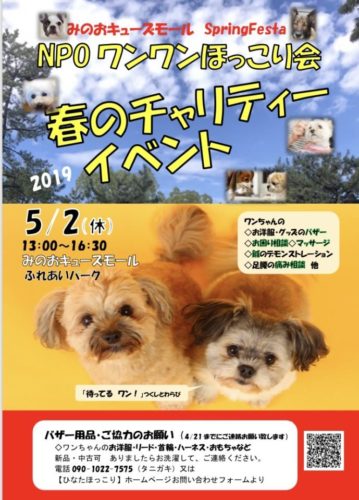 ゴールデンウィーク5/2【NPOワンワンほっこり会 春のチャリティーイベント】inみのおキューズモール 開催のお知らせとバザー用品の協力のお願い