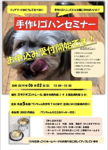 【ワンちゃんの手作りゴハンセミナー 】開催のご案内 2019/06/02(日)13時~ 会場はスタジオコントレールさま・お申し込受付します 先着5名さまです